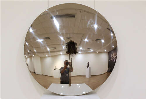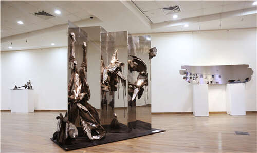 《静观》展览中的九件作品显然不是为了解决形体的问题,材料的问题,空间的问题。它们直指的是雕塑的存在方式,因为这些雕塑并不强调单独的“实体”,强调作品的独立存在。在这些雕塑中,最鲜明的特点是,每件作品都有大小不一的“不锈钢镜面”,这一面面“镜子”把自己割让出来,交付出去。它们映照四周,吸纳四周,它们和展场环境、和现场观众共同营造出了一个互动的现场,只有依赖这个“场”,雕塑才能真正获得“存在”。