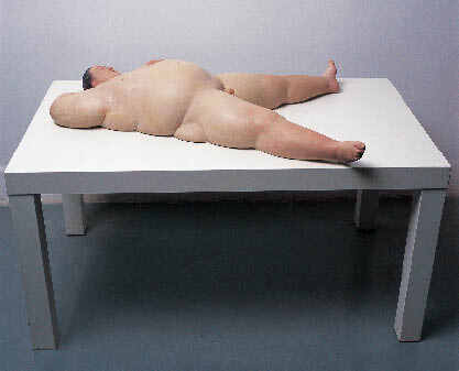 展览作品总数八件,人物尺寸上大小差别悬殊,最大的一件,高度为2.6米,胖子双手扶膝,躬身而立,顶住天花,霸气地堵在入口处。最小的一件只有14厘米长。除一件作品中人物使用了特殊材料外,其余还是采用树脂着色的手法,个别作品特别栽植了毛发,安装了塑料眼珠。这些大大小小的人物,虽为胖子,却没有大肥肉一堆的感觉,而是制作精致,形做得完整到位,着色细腻温润,并非当下许多艺术品以出位刺激来吸引观众的做法,整体呈现出古典的美感。决定在“aye画廊”做展后,牟柏岩对画廊空间进行了仔细研究。他切合“aye画廊”的内部空间,合理设计了作品的尺度,空间的布置安排可谓独具匠心。展览将画廊本身也纳入作品中,八件作品同时也是一件完整的大作品。