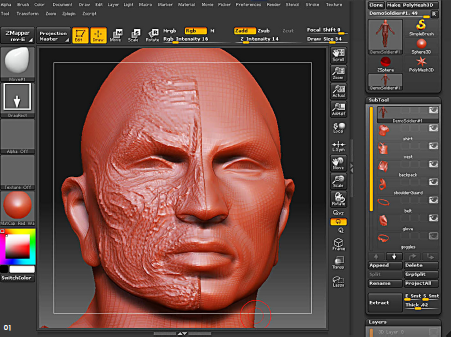 建模方面,ZBrush是一个极其高效的建模器。它进行了相当大的优化编码改革,并与一套独特的建模流程相结合,可以让艺术家制作出令人惊讶的复杂模型。无论是从中级还是到高分辨率的模型,艺术家的任何雕刻动作,诸如Move、Stitch、layer、Flatten等,虚拟的三维造型都会瞬间得到回应,其手法与传统雕塑极为相似, 我们可以做挤压、揉捏、平滑等动作。另外,Zbrush拥有独特的A1pha通道贴图造型,这样就可以使三维造型艺术家能够轻松模拟出真实的材质肌理效果,如同雕塑家用专门制作的造型工具来实现作品的纹理特征。另外zBrush强大的模型创建方式还包括了 一种叫做ZSphere的模型结构,通过该工具可以迅速地以球体与球链的组合概括任何形体特征,从而生成网格物体,再经过细分并逐步雕刻,最终可以制作出极致细腻的效果。