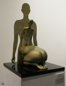 此次中韩雕塑交流展在坐落于首尔的现代艺术中心举办。位于繁华区域的两层展厅,展出了中韩两国雕塑家们的近200件精品之作,为艺术家们架起了交流与沟通的桥梁。这些富于文化意蕴与当代气息的作品,既彰显了两国艺术家不同的文化身份,也体现了各自不同的艺术追求。通过这次展览,中国雕塑家们领略到了韩国当代艺术的创作面貌。韩国雕刻家协会会长金永元被公认为自上世纪70年代以来,韩国艺术中最具创造性的艺术家之一。《引力-非引力》系列是金永元在韩国雕塑史上引起轰动的作品。该系列以“空间雕塑”的概念代替了传统雕塑的写实造型语言。艺术家没有按照现实主义的造型手法塑造生动翔实的形体及情态细节,而代之以不动声色的人形剪影,将丰富的情感掩藏于“空白”的面目下,颇像橱窗里面无表情的人形模特儿。《引力-非引力》系列是金永元在造型艺术领域中进行的大胆尝试。在被冠以“现实主义”甚至“超现实主义”的标签后,金永元将扎实的造型语言功底与当代文化语境相结合,成功地实现了对雕塑艺术“负空间”的探索。韩国雕刻家协会副会长申银淑女士的作品将两种颜色的石材穿插镶嵌,光滑的表面透出淡淡的光泽,融合了女性特有的柔美细腻和石材的冷静坚毅。韩国著名雕塑艺术家韩镇燮的石雕作品将坚硬冷漠的石材赋予温情、诙谐和童趣,从他的作品中可以解读出作者对生命、生活以及自然的发自内心的爱意。韩镇燮的作品以小动物和人物居多,作品的尺度强调了艺术与人的亲近感与参与性,在首尔的很多雕塑公园都可以见到他的佳作,给首尔的公共环境注入温馨与友爱的气息。中国雕塑学会会长曾成钢的作品《咏蛙》在造型上借用了中国商周时代青铜器的造型元素和审美理念,同时吸取了抽象表现主义的处理手法,使东方和西方的艺术语汇在作品中得到完美的契合。作品的空间构成强调气韵生动,尽管这件作品体量不大,但可以管窥曾成钢艺术创作的一贯风格,即大气、雄浑、富有张力,给人一种气宇轩昂、咄咄逼人的气势,充满王者风范。中国雕塑学会常务理事殷小烽教授的作品《喇嘛No.5》是近年来的新作。殷教授出于对神秘的西藏文化的向往,曾远离都市的纷扰深入藏区。在那里,殷小烽感受到弥漫在雪域高原中无处不在的宗教力量,特别是西藏的神职人员喇嘛对尘世的漠然和对信仰的执著深深打动了他。殷小烽以写意的手法,在浮雕平面上叠加勾勒出喇嘛的朦胧形象,既浑然一体,又神态各异,画面充满涌动感,层次清晰精到。在压缩的平面中可以感受到庞大的僧众群体在朝圣的路上涌动的壮观场景,斗方之间承载着民族历史的悠远与博大。