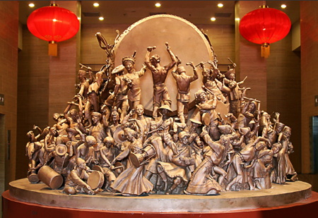 选择各民族欢庆节日时常有的击鼓跃舞,这是对各民族和睦友爱、共建家园的最有声势、最热烈、最能振奋人心的表达方式,是抓住了群众喜闻乐见的形式。雕塑处理成圆形构图,加上大鼓小鼓的圆形,正好寓意大团圆、大团结,形成鼓舞人心的热烈场面。