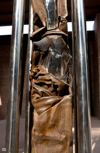 这里所说的“尊重材料”,受到王林先生1996年在成都所做的雕塑展览“敬畏生命”的启发。在我看来,“尊重材料”应该是雕塑艺术家“尊重自然”的一个基本艺术态度。围绕我们生活的所有材料,无论是自然界的原始材料还是人类加工生产出来的材料,都是有生命的,即它们有自身的生成与转换的自然周期,同时它们也负载了人类生命与材料的互动,成为生命价值和意义的载体。从金属雕塑的角度,面对人类对于物质材料的生产和艺术性的结构重组,我更注意后者的创造性的结构关系。金属雕塑与工业材料加工的区别,在于艺术家通过对不同物质材料的造型重组,使之呈现出非功利性的人文意义。在古德语中,“物”这个词意味着聚集和统一,特别是对于考虑言说中的事情,一种争议的聚焦。对于金属雕塑家来说,具有挑战性的问题不只是材料加工的技术,而且是材料选择与重组的视野,即对于材料的选择,就是人对材料的意义的基本把握,是重新敞开人对于材料的关系,回到事物本身去,回答生命的原始呼唤。在这一意义上来说,“尊重材料”就是“敬畏生命”,就是尊重艺术所具有的人文意义。古人形容音乐中的器乐演奏为“金声玉振”,“金属之声”的意义不仅是指敲打金属会有声音,而且是说我们要倾听金属雕塑的内在生命传达给我们的声音和信息。
