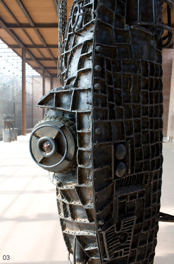 技术美感是金属雕塑创作的独特性之一,这不仅表现为对金属材料在不同加工技术条件下所呈现的色彩、肌理、结构乃至光线影像的不同形式美感的体悟和创造,也表现为对不同的金属加工技术和机械工具的娴熟运用所产生的特殊美感。例如,对不同焊接技术的掌握和运用,可以形成各种特殊的焊接痕迹与焊纹肌理,形成不同的视觉美感。而不同的金属在不同温度下的淬火或打磨,可以形成不同的金属表面的色彩。